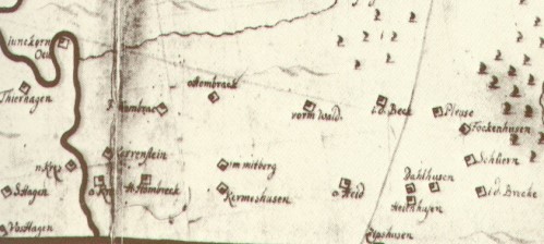 Dieser Kartenausschnitt ist einer Karte des Amtes Beyenburg entnommen. Das Original liegt im Staatsarchiv in Düsseldorf, doch gibt es Nachdrucke der “Topographia Ducatus Montani”, die auch diese Karten enthält. |
